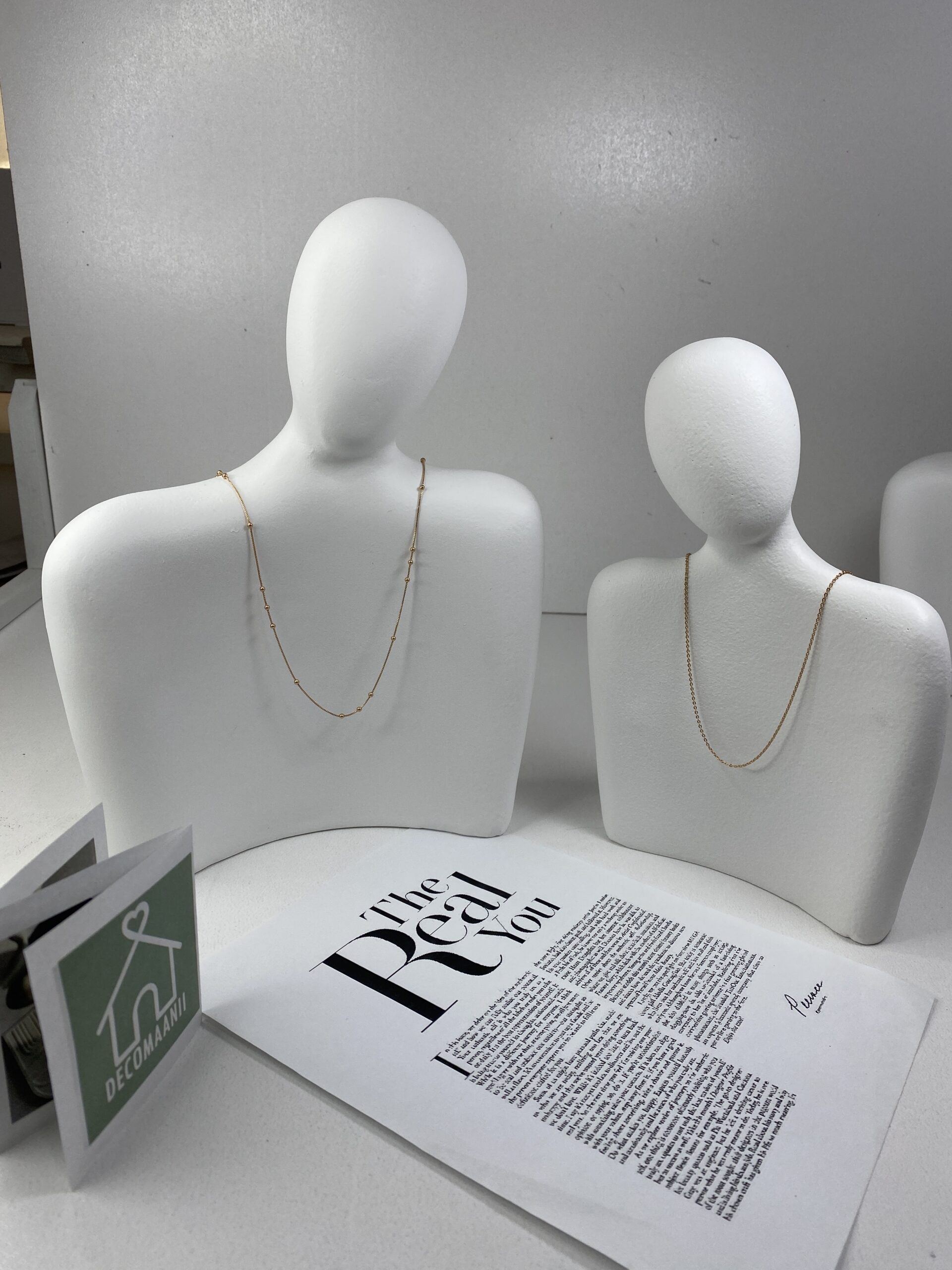 فرم مانکنی این مدل باعث میشود افت گردنبند کاملاً طبیعی دیده شود و زنجیر حالت واقعیتری نسبت به عکسهای تخت یا استندهای ساده داشته باشد. سطح مات، بازتاب نور را کنترل میکند و در نور طبیعی یا نور ثابت، نتیجهای حرفهای و بدون نویز میدهد.