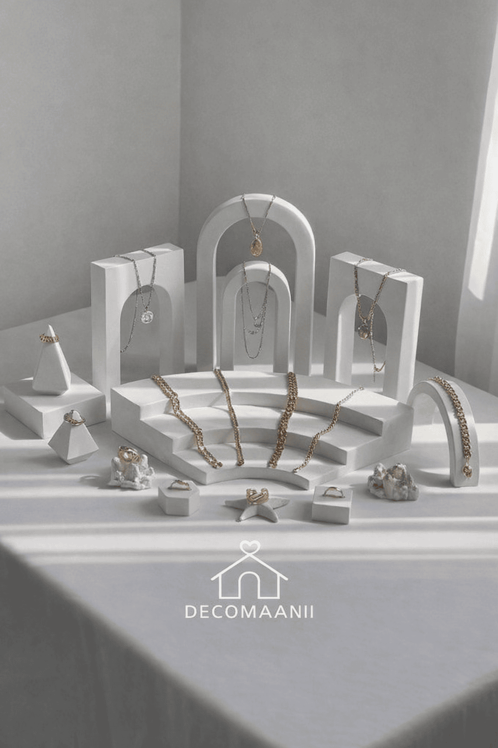 ویترین آماده جواهرات مینیمال – کد ۴، ست کامل استندهای سفید برای چیدمان حرفه‌ای گردنبند، دستبند و انگشتر در ویترین طلافروشی و عکاسی محصول.